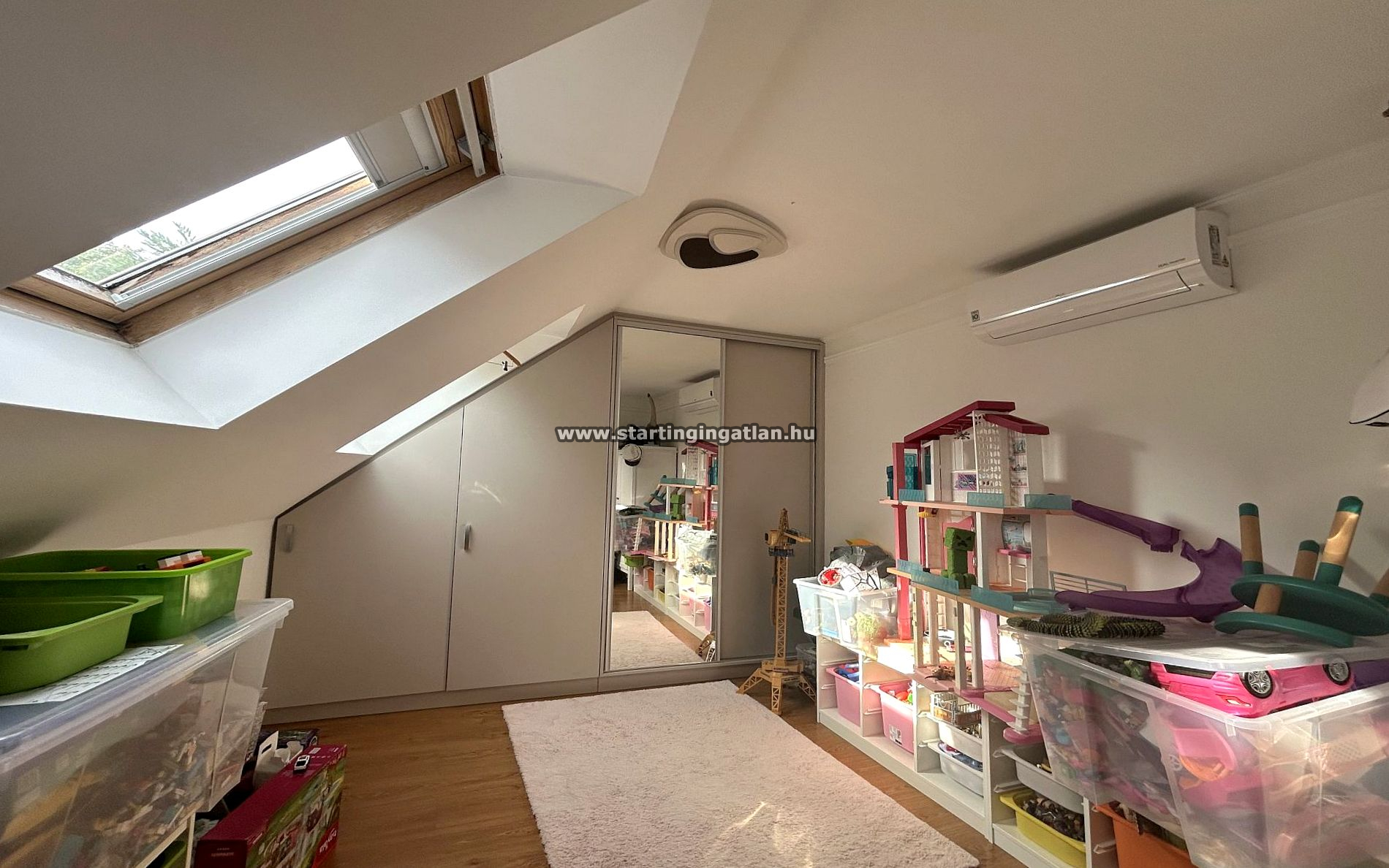 Eladó a 3. kerület Kocsis Sándor úton egy 175 m²-es ikerházfél, amely 49 m²-es, kétállásos garázzsal és tárolóval, hatalmas első terasszal, faburkolatú hátsó napozóterasszal és fűthető, 8x4 méteres medencével kínál páratlan kényelmet. A nyeles telek biztosítja a teljes nyugalmat, mégis mindössze pár perc sétára van a játszótér és a buszmegálló.